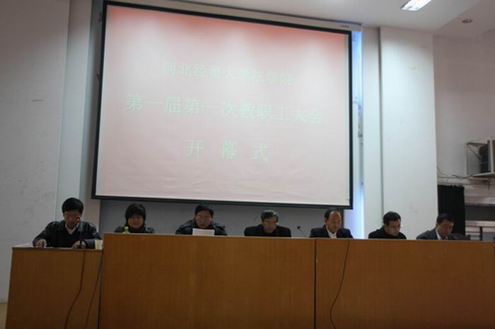 本次教职工大会由太阳成tyc33455ccwww公司胡育勇副书记主持,由党总支书记郭广辉致开幕词,公司党委副书记耿彦君发表重要讲话,太阳成tyc33455ccwww经理柴振国作了《科学发展、务实创新、努力开创太阳成tyc33455ccwww工作新局面》的公司工作报告,公司分工会主席齐向晖作了《发挥桥梁作用、营造和谐氛围、形成合力促发展》的工会工作报告,副书记胡育勇作了第一届第一次教职工大会提案征集工作报告,副经理赵朴英报告了《太阳成tyc33455ccwww团队建设规划》,副经理刘春霖报告了《法学国家特色专业建设规划》。