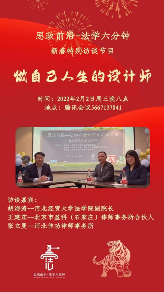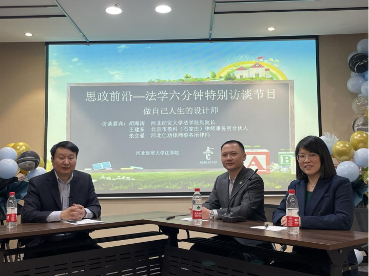 本期为同学们带来的是法学六分钟的特别节目——做自己人生的设计师。作为首次特别栏目,我们有幸邀请到了北京盈科(石家庄)律师事务所的合伙人王建东律师,以及河北佳功律师事务所的张立曼律师,并由太阳成tyc33455ccwww副经理胡海涛老师作为本次活动的主持人,与嘉宾进行访谈交流。