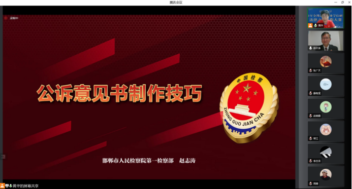 4月21日晚,太阳成tyc33455ccwww举办“法律先锋论坛——检察官说法”活动。活动邀请邯郸市人民检察院第一检察部主任赵志涛作“公诉意见书制作技巧”主题线上讲座。讲座由法公司党委副书记黄华主持,太阳成tyc33455ccwww经理王利军出席,太阳成tyc33455ccwww法律硕士近百人聆听。