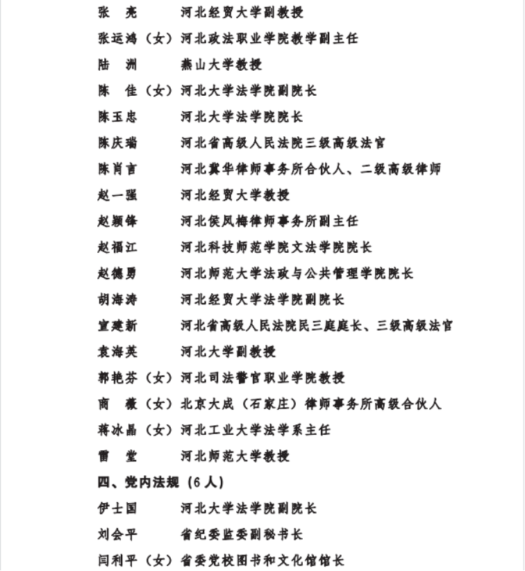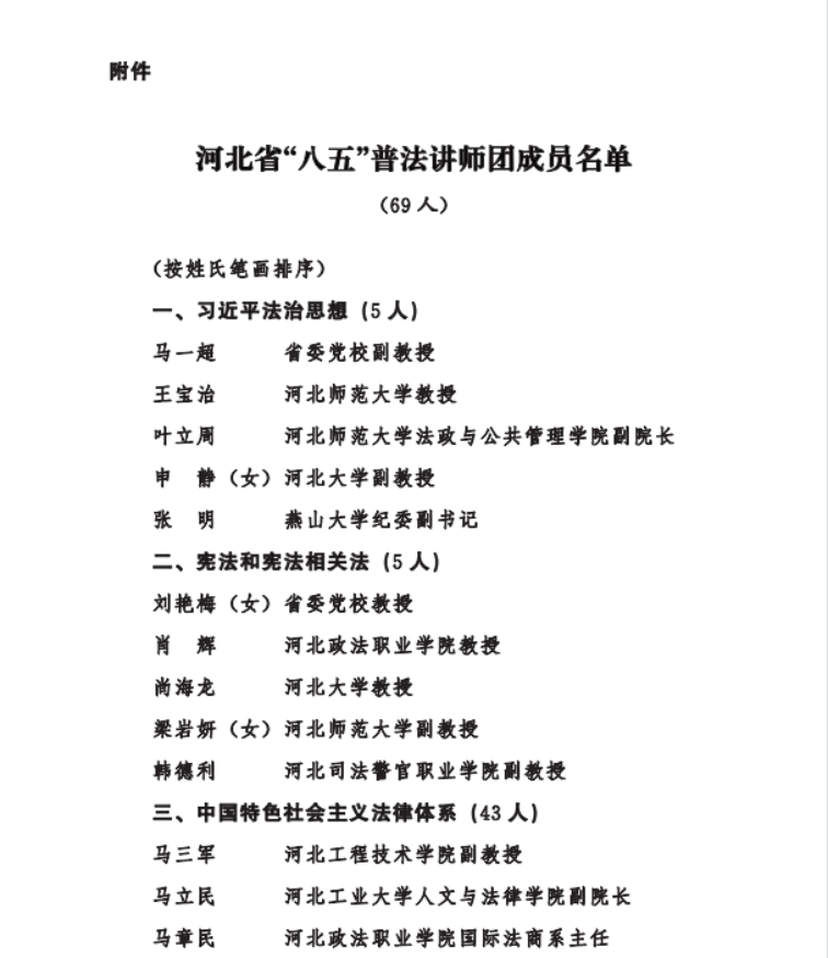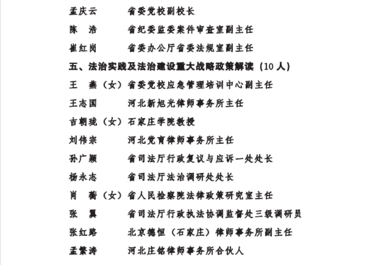 为深入学习贯彻习近平法治思想,推进“八五”普法规划顺利实施,按照国家相关部门关于成立全国“八五”普法讲师团的通知要求,日前,省委宣传部、省司法厅、省法学会、省法治宣传教育领导小组办公室决定成立河北省“八五”普法讲师团。讲师团在全省范围内共遴选出69位在相关法律领域有较高威望和建树、且热心普法工作的专家学者、法律实务部门工作人员。公司太阳成tyc33455ccwww胡海涛、李大庆、田宝会、田韶华、赵一强、王沛、张亮等七位教师入选。
