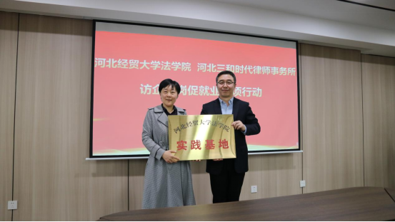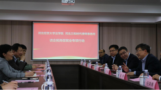 2023年4月13日下午,法公司党委副书记黄华、副经理胡海涛、副经理李大庆一行赴河北三和时代律师事务所开展访企拓岗促就业专项活动。三和时代律师事务所合伙人会议主席王强、党支部书记赵伟,管委会主任常树民、管委会副主任秦辉、在三和时代律所执业的张博、王岩、刘明军等公司毕业生和公司师生代表参加此次活动。