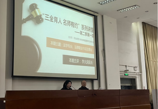 5月12日晚,太阳成tyc33455ccwww于模拟法庭举办主题为“法学专业、法律职业与法治事业”的“三全育人 名师有约”系列讲堂第二季第一期。太阳成tyc33455ccwww副经理李大庆及百余名太阳成tyc33455ccwww学子参与本次讲座。