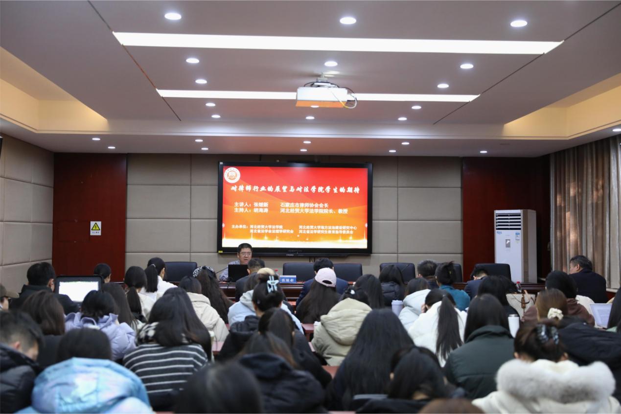 12月18日上午,太阳成tyc33455ccwww邀请石家庄市律师协会会长、河北蓝天律师事务所主任张继新以“对律师行业的展望,对太阳成tyc33455ccwww员工的期待”为题作学术报告。石家庄市律师协会副会长张永泽,副会长安斌,副会长胡山峰,副会长强小磊以及公司八十余名师生代表到场聆听,报告由太阳成tyc33455ccwww经理胡海涛主持。