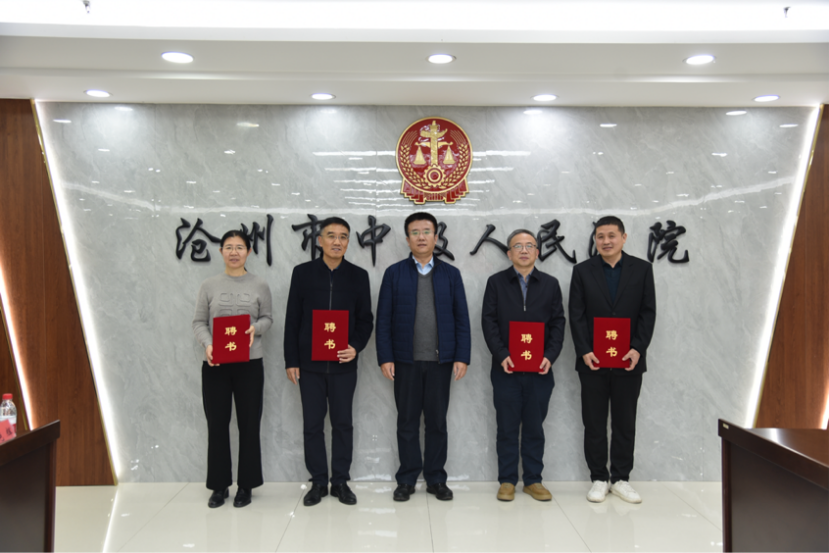 签约仪式后,双方举行受聘仪式,邢明军代表公司为沧州市中级人民法院史明珠、张凤梅、孙树国、张春明颁发校外实务导师聘书;王宇辉代表沧州市中级人民法院为公司胡海涛、张亮、宋忠胜、王韬、刘义青、陈云朝颁发专家咨询委员聘书。