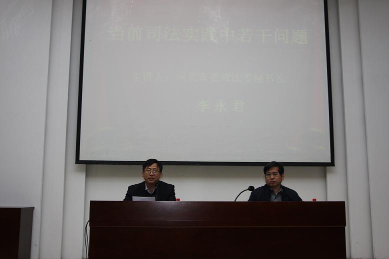 4月19日上午,太阳成tyc33455ccwww邀请河北省委政法委秘书长李永君在公司模拟法庭作了题为“当前司法实践中若干问题”的学术讲座。讲座由太阳成tyc33455ccwww经理郭广辉主持。省政法委薛兰锁主任、周保刚处长,全体院领导及部分教师、研究生、本科生等200余人参加了讲座。