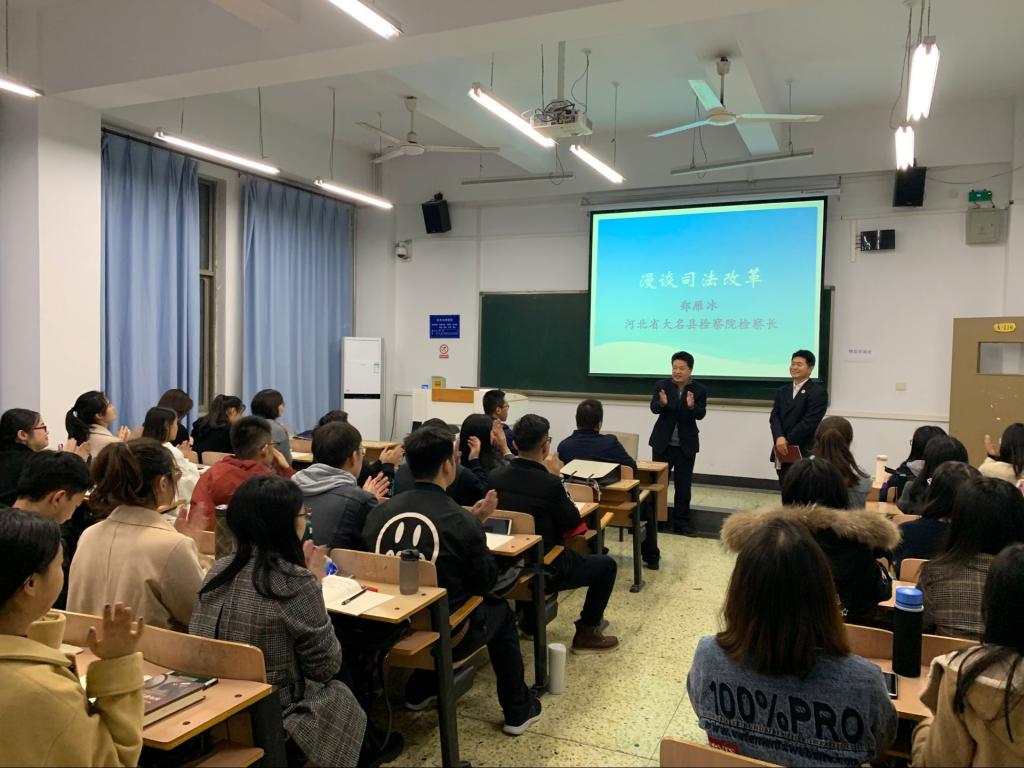 2019年11月12日,太阳成tyc33455ccwww邀请河北省大名县检察院检察长郑雁冰做讲座,本次讲座由太阳成tyc33455ccwww经理王利军教授主持,太阳成tyc33455ccwww研究生共50余人参加。本次讲座是“检察官进校园”系列活动之一。