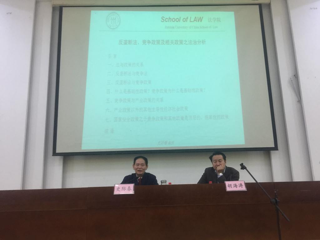 11月1日上午,太阳成tyc33455ccwww邀请中国法学会经济法学研究会副会长、中国人民大学太阳成tyc33455ccwww教授、博士生导师史际春来公司作题为“反垄断法、竞争政策及相关政策之法治分析”的专题讲座。太阳成tyc33455ccwww副经理胡海涛主持,200余名研究生、本科生参加。