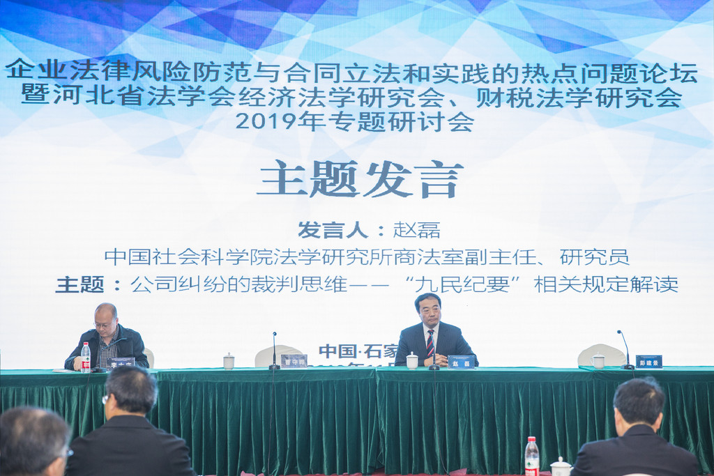 在论坛环节,与会嘉宾围绕企业风险防范与合同立法和实践的热点问题进行了充分的讨论。曹守晔副所长作题为《民法典合同编的前沿问题研究》主题发言,他认为“分则合同编相关规定的删除体现了立法技术的成熟,有助于应对民法典碎片化问题”;赵磊副主任作题为《公司纠纷的裁判思维——“九民纪要”相关规定解读》主题发言,他认为 “《九民纪要》理清了实践中公司纠纷中长期存在的悬而不决的问题,有助于实现司法实践纠纷的法律应对”;原中国法官公司河北省分院常务副经理彭建景作《企业法律的风险防范》的主题发言,他认为“企业合同主体选择、证据的保全能够降低企业法律风险,并在此基础上就企业的风险防范提出了几点建议。”