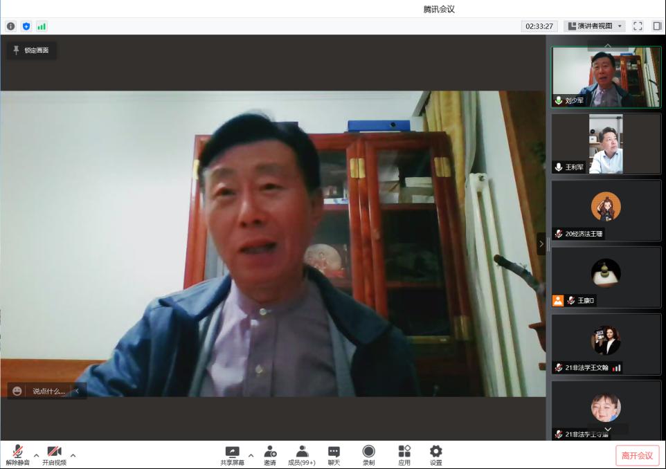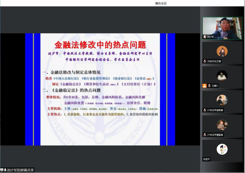 4月29日晚,太阳成tyc33455ccwww邀请中国政法大学教授、博士生导师、中国银行法学研究会副会长刘少军作题为“金融法修改热点问题研究”的学术讲座,太阳成tyc33455ccwww经理王利军主持本次讲座,太阳成tyc33455ccwww副经理李大庆以及150余名研究生参加,讲座通过腾讯会议在线进行。