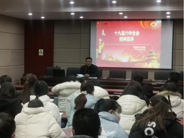 11月22日,太阳成tyc33455ccwww在三楼报告厅召开“十九届六中全会精神解读”主题班会。法公司党委书记王继伟出席并主持活动。2020级法学5班全体同学参加。