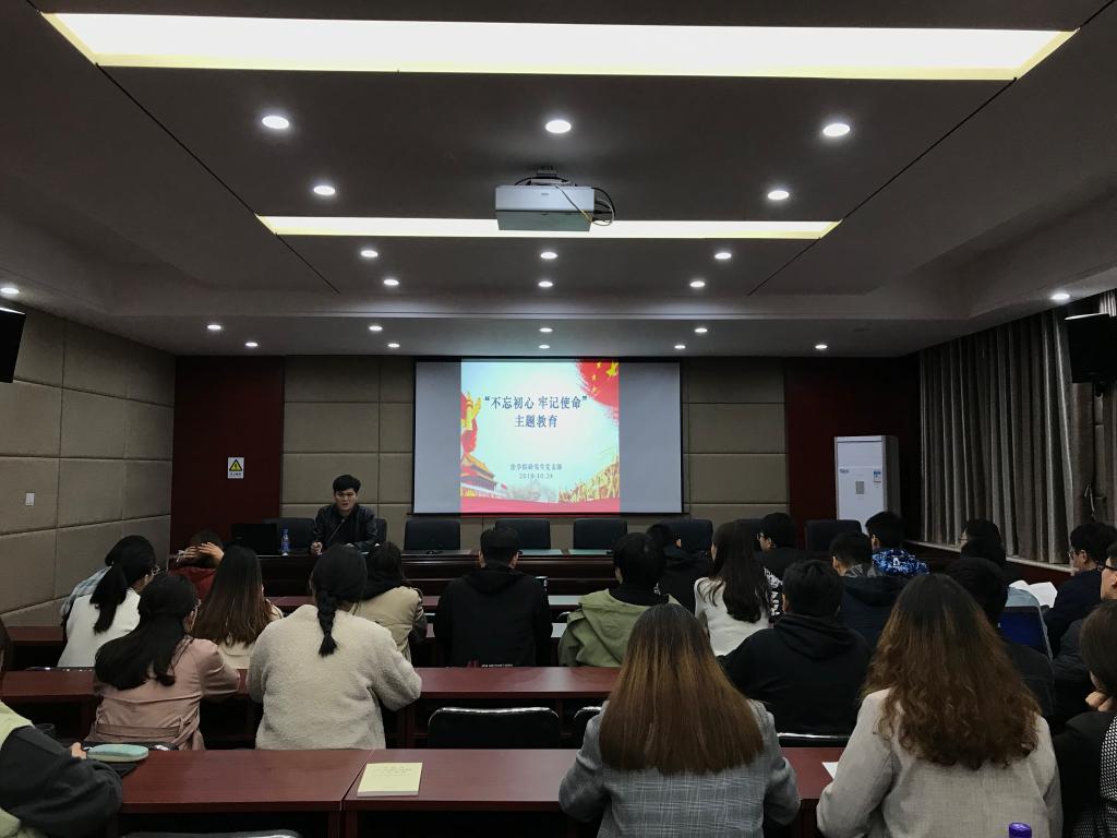 2019年10月24日下午,太阳成tyc33455ccwww研究生党支部于模拟法庭报告厅开展“不忘初心、牢记使命”主题教育,研究生党支部书记陈运涛和支部党员40多人参加。