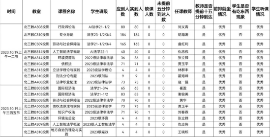 教学运行总体情况良好。检查组安排33名工作人员分别到各个教室,对10月19日上午的上课情况进行了全面检查,共检查17个教学班。教师们提前到达教室并打开课件,同学互动积极性较高,课堂气氛活跃。同学们能够跟上老师的思路,参与课堂教学之中,认真思考课堂知识,及时记录课堂笔记,课堂纪律优秀,无在教室吃东西以及迟到现象。