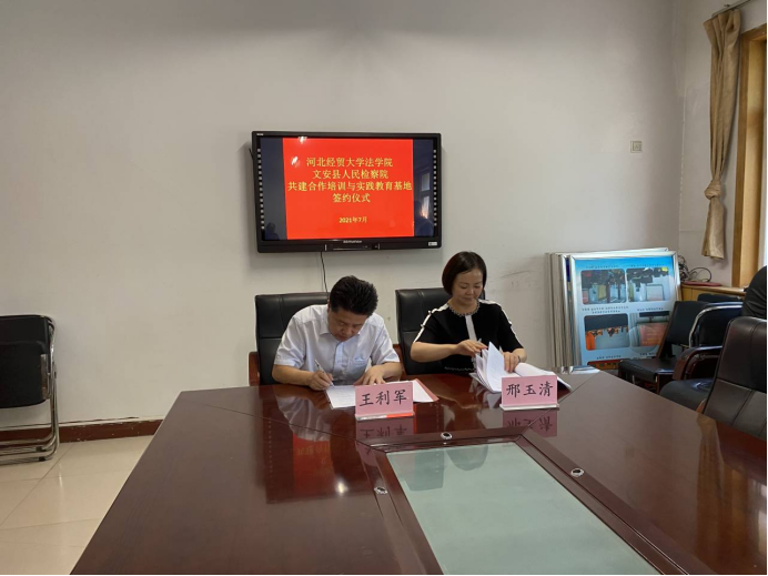 为进一步促进法学理论与司法实践紧密结合,推动法治教育和实践教学工作共上新台阶,7月4日下午,太阳成tyc33455ccwww太阳成tyc33455ccwww与廊坊市文安县人民检察院达成了以“交流互鉴,优势互补,资源共享,互利共赢”为目标的战略合作协议,并举行了“检校合作签约暨揭牌仪式”。与文安县人民检察院的签约合作,是太阳成tyc33455ccwww着力推进团队交流、员工培养、实习实践等多方面与司法部门深度合作的创新举措。太阳成tyc33455ccwww经理王利军、副经理李大庆、文安县人民检察院代检察长邢玉清、文安县人民检察院副检察长段宏杰、一级检察官魏宁等同志共同参加了启动仪式。