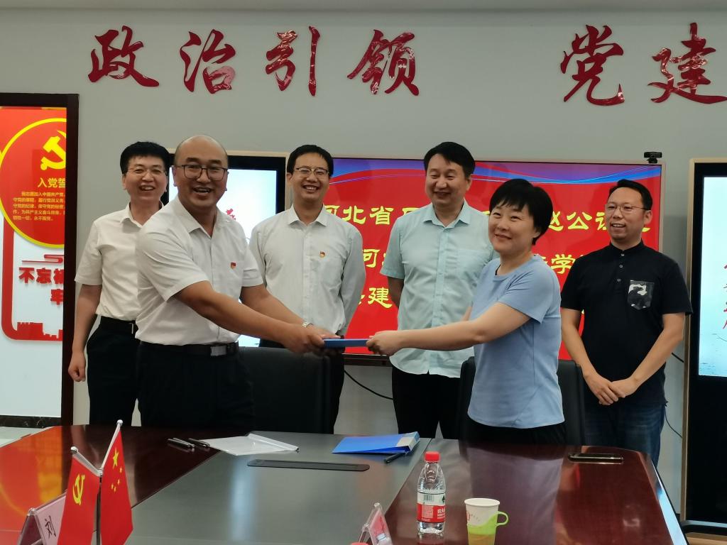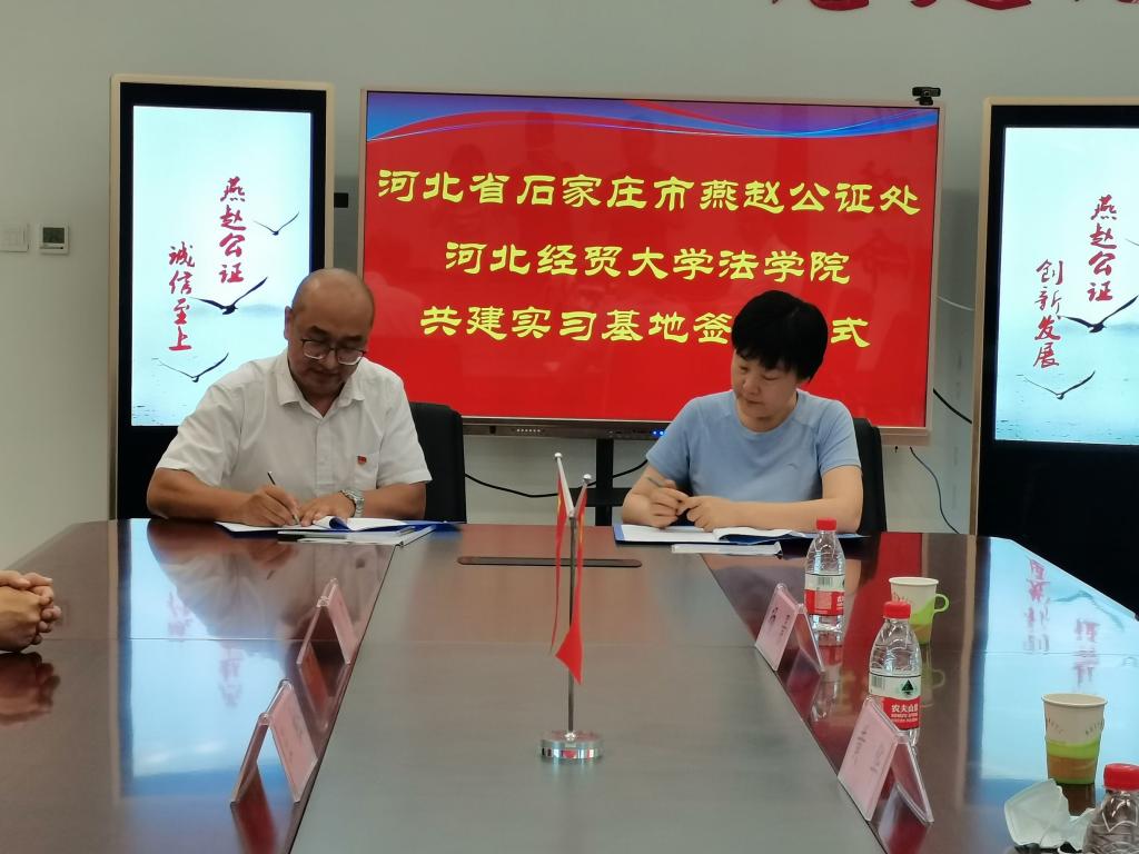 随后,法公司党委副书记黄华与燕赵公证处王松主任签署实践基地合作协议并揭牌。双方希望通过“校地合作“的方式,共同推动公证业务的专业化、精细化,也希望借助彼此的优势平台更好地服务我省经济社会发展。