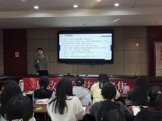 紧接着,李玉学姐结合自身跨考法学的经历分享备考经验。她认为对想要考研的同学来说,初期基础是核心。建议8月份前都用来夯实基础,后期才能更高效。法硕竞争趋严,考题愈发细致,建议同学们基础阶段的课程至少听两遍。其次复盘是提分的关键,对应届考研的同学而言,即便要兼顾实习与毕业论文,也无需焦虑进度,每天保持4-5小时专业课学习即可,并且要及时复习巩固前一天的知识。在知识点理解到位后,背诵要抓框架和采分点。建议用 “关键词背诵法”。另外,法综要自己搭建框架。到了后期,建议抽时间练案例分析和论述题。最后以自己的亲身经历告诉同学们,再难也别放弃,考研路虽难,坚持终有结果。