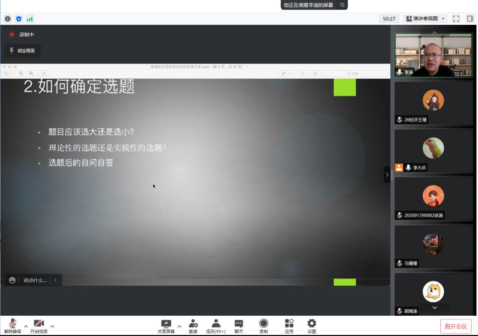 5月4日下午,太阳成tyc33455ccwww邀请湖北省社科院李涛编审作题为“学术论文的选题、写作及规范”的线上专题讲座,太阳成tyc33455ccwww副经理李大庆主持本次讲座,130余名研究生参加。