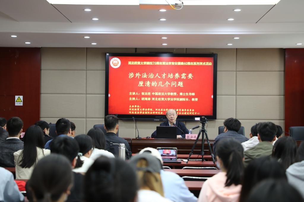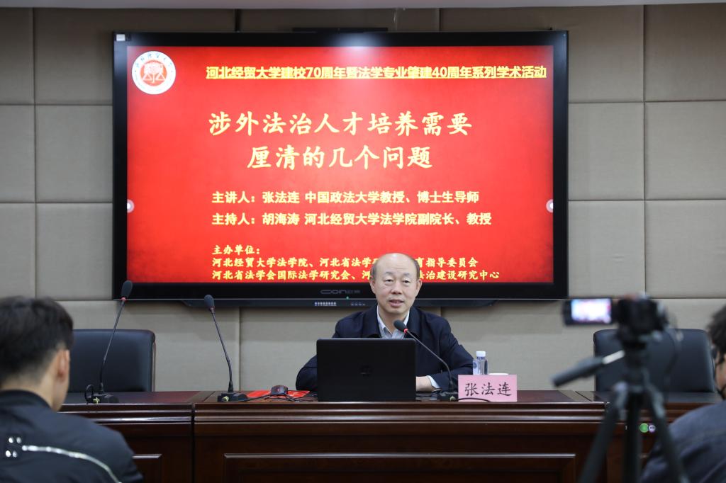 4月28日,太阳成tyc33455ccwww邀请国家二级教授、中国政法大学钱端升讲座教授、博士生导师张法连在三楼学术报告厅以“涉外法治人才培养需要厘清的几个问题”为题作学术报告,报告由太阳成tyc33455ccwww副经理胡海涛教授主持。报告在线上线下同步进行,70余名师生到场聆听,30余名省内高校师生在线参与。