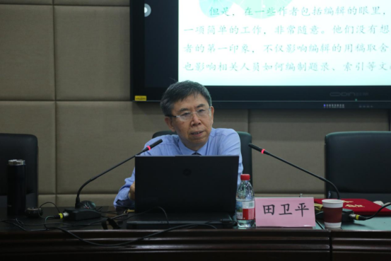 田卫平巧妙运用生活场景类比,以购物时 “一看二停三比四买” 的决策逻辑,生动对应期刊论文吸引读者的四步流程,迅速拉近与在场师生的距离,自然引出本次报告的核心主题。在核心内容分享环节,田卫平聚焦期刊论文标题创作中的常见问题,针对 “文不对题、观点外露、平庸乏味、含混不清” 等十大典型误区,结合大量真实反面案例进行深入浅出的剖析。他明确指出,优质的期刊论文标题需引发 “视觉冲击” 与 “阅读冲动” 的 “两冲” 化学反应,既要精准概括研究内容,又要具备足够的吸引力。田卫平立足编辑视角,结合自身数年学术出版经验,围绕历史学、政治学、经济学等不同学科领域的论文特点,从内容提炼与技术优化两大维度展开详细讲解,并通过具体的标题修改示例,直观展示 “平庸标题” 到 “亮眼标题” 的升级路径,让在场师生受益匪浅。报告尾声,田卫平对学术期刊论文标题创作的核心原则进行总结,强调标题需满足 “题文相符、简明扼要、语义清晰、词语规范、分行合理” 五大要求,其中 “简明扼要” 是贯穿始终的核心准则,需在有限字数内精准传递研究核心价值。