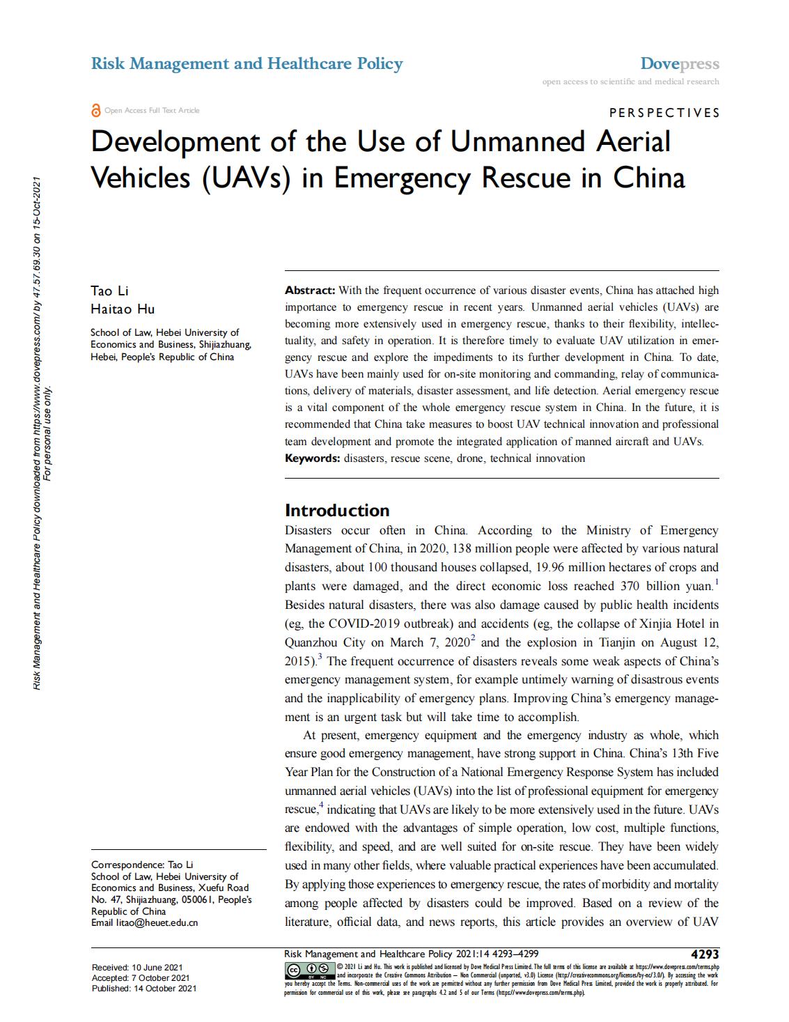Abstract: With the frequent occurrence of various disaster events, China has attached high importance to emergency rescue in recent years. Unmanned aerial vehicles (UAVs) are becoming more extensively used in emergency rescue, thanks to their flexibility, intellectuality, and safety in operation. It is therefore timely to evaluate UAV utilization in emergency rescue and explore the impediments to its further development in China. To date, UAVs have been mainly used for on-site monitoring and commanding, relay of communications, delivery of materials, disaster assessment, and life detection. Aerial emergency rescue is a vital component of the whole emergency rescue system in China. In the future, it is recommended that China take measures to boost UAV technical innovation and professional team development and promote the integrated application of manned aircraft and UAVs.