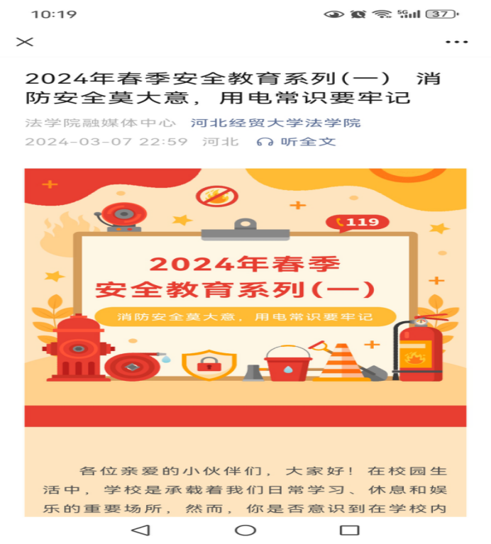 公司微信公众号及时推送消防安全教育材料。公司于3月15日9时组织本科生研究生80多人集中收看了由国家消防救援局,教育部联合举办的春季校园火灾疏散逃生演练公开课的直播,并且由辅导员梁贺超详细介绍了本次消防逃生演练的工作计划,具体要求以及注意事项,这使得同学们进一步掌握了火灾预防知识,逃生技巧以及疏散流程。