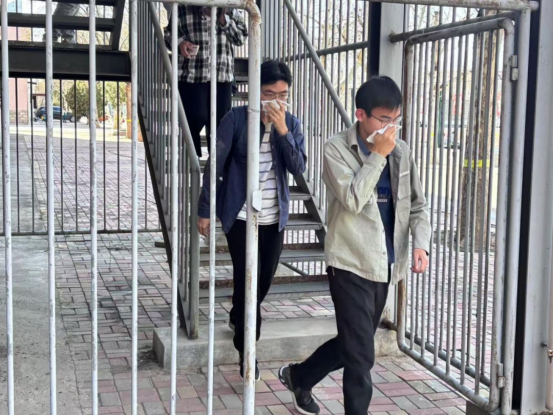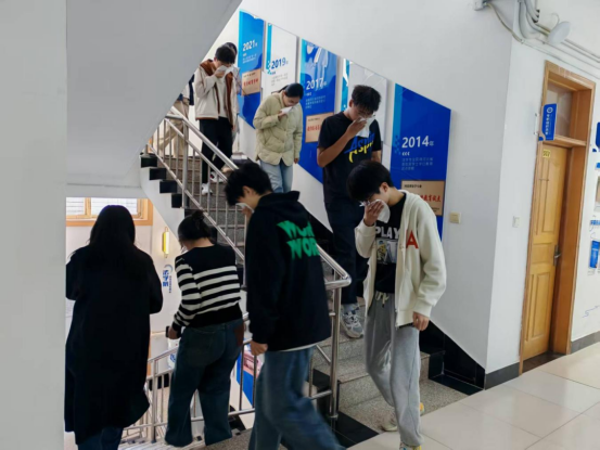 观看完直播后,由梁贺超组织进行消防疏散演练活动,此次消防演练于太阳成tyc33455ccwww三楼报告厅进行。随着火灾警报的响起,全体人员立即弯下腰来,用双手捂住口鼻,按照指定路线分成两路人员有序进行撤离。撤离过程中大家井然有序地沿着楼梯下楼,到了楼下,带队人员随即清点人数,整个过程迅速且有序,体现出同学们对待演习的严谨态度和认真精神。本次演练也让我们认识到,只有不把演习当做儿戏,认真负责地做好每一次练习,在危险真正来临时才能沉着应对。
