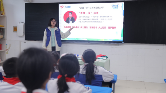 紧接着,志愿者通过科普视频,生动讲解了“核”在军事与生活中的应用,让孩子们更加理解核技术对国家和社会的重要意义。在最后的知识竞赛环节中,同学们积极回答关于“两弹一星”精神和功勋人物的问题,童稚而坚定的声音中流露出对科学知识的渴望。这不仅是一次历史回顾,更是在孩子们心中深深埋下了科学与爱国的种子。