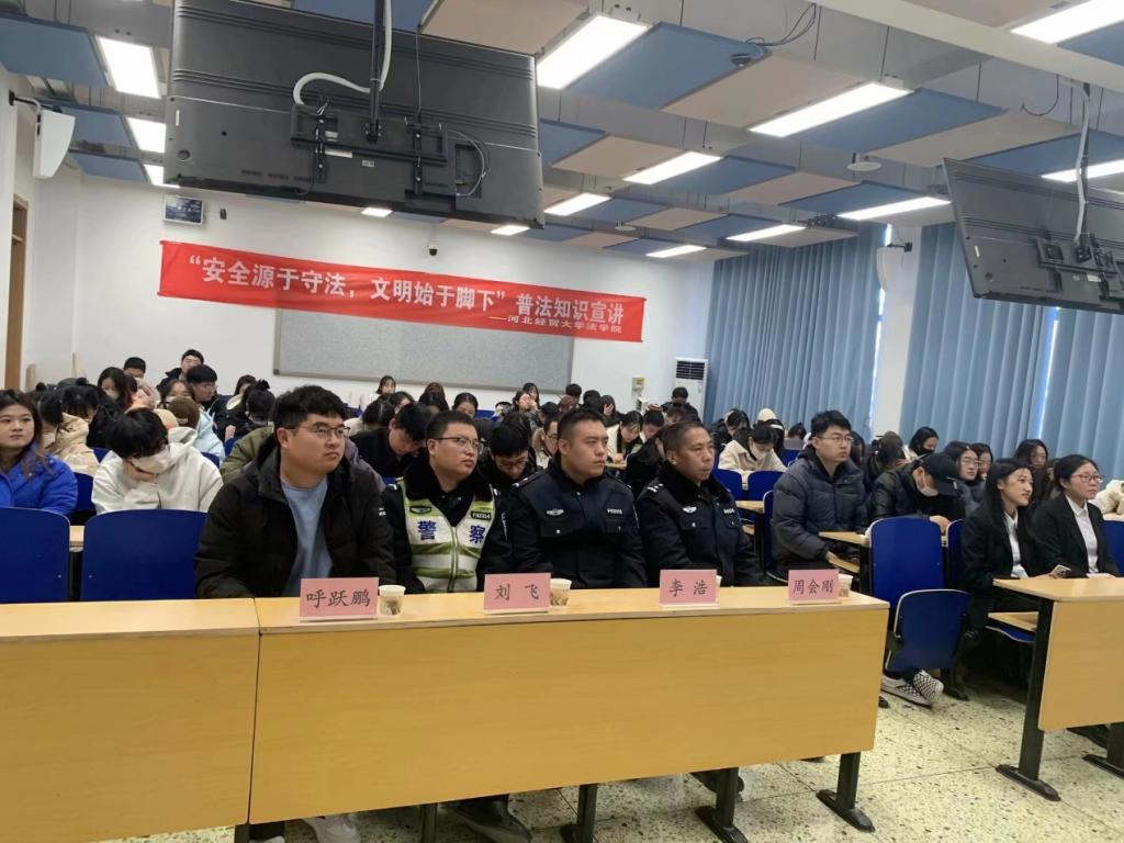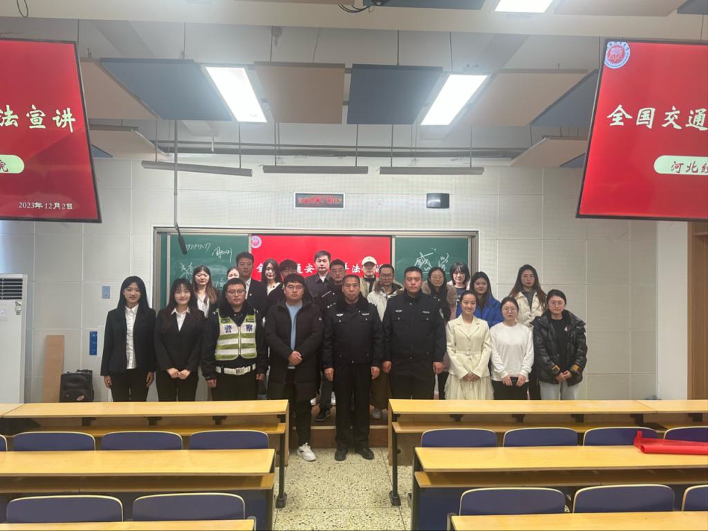 2023年12月2日上午,太阳成tyc33455ccwww于北三教A103举办“安全源于守法,文明始于脚下”全国交通安全日普法知识宣讲。杜北街道司法所呼跃鹏、石家庄市新华区交警大队周会刚警官、李浩警官、刘飞警官出席本次活动,太阳成tyc33455ccwww学子共90余人参加。